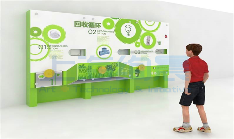 展项由垃圾分类区和观众互动区两部分构成,主要向观众介绍垃圾分类的相关知识。